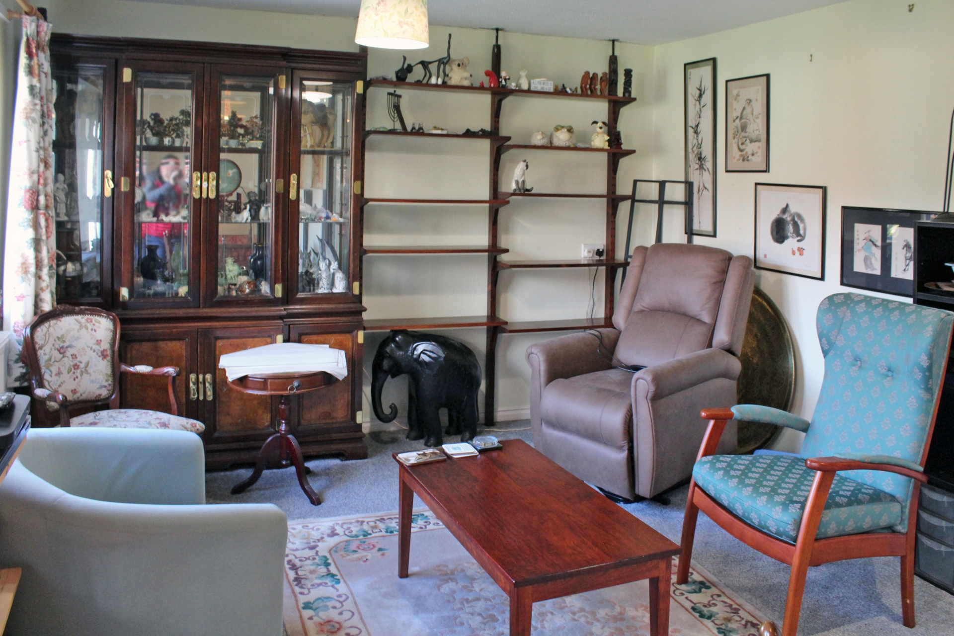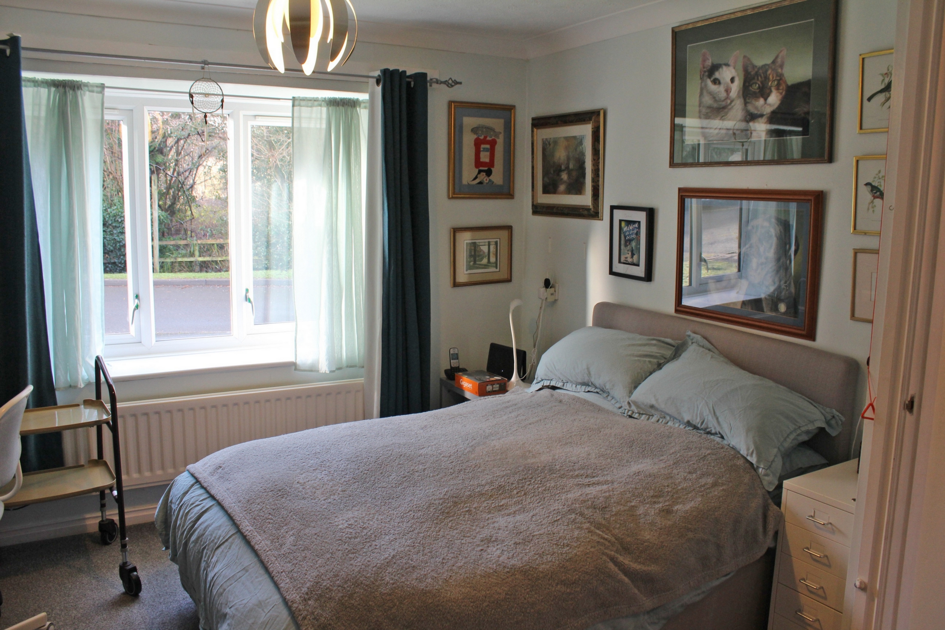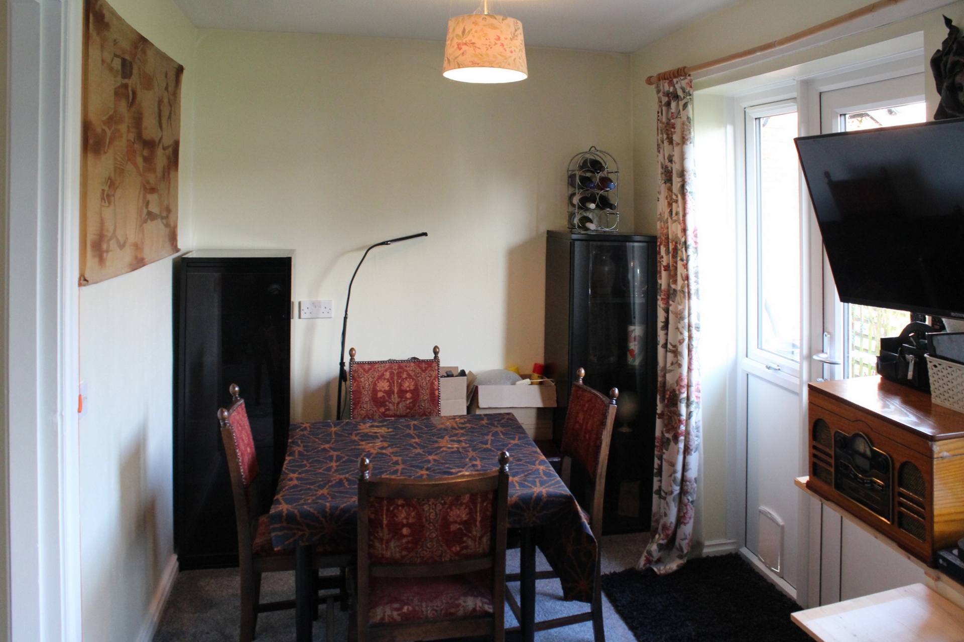 | Hall | with cloaks cupboard, further store cupboard, electric storage heater, fitted carpet.